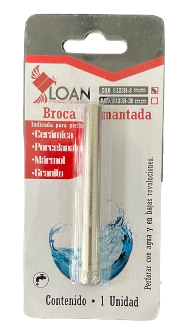 Broca diamantada 8 mm. Marca Loan. Para perforar: cerámica, porcelanato, mármol y granito. (Perforar con agua y en baja revolución)