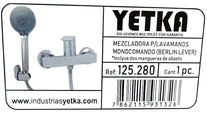 Mezcladora monomando, teléfono, sobrepuesta para ducha. Marca Yetka, modelo berlin / lever, cromada. Distancia entre manijas 15 cm. (6″). Incluye ducha manual doble función y manguera. Código: 125280