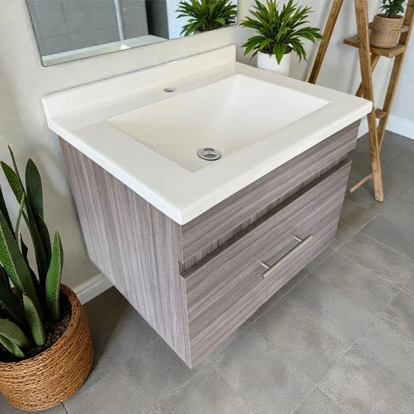 Mueble Nacional en material MDF, Diseño flotante, incluye Lavatorio de mármol cultivado en color blanco. Modelo Lugo. Medidas: 59×46 cm. (mediano)