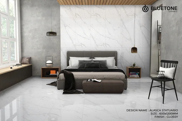 Porcelanato brillante, marmoleado. Caja de 1.44 m2. // 2 unidades por caja. Importado de la India Bluetone, formato 60×120. Usos: pisos interiores, paredes interiores y exteriores. Alta variación en diseño y tonalidad (V4).