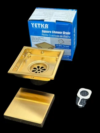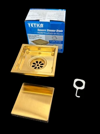Rejilla cuadrada, marca Yetka, código 125598-GDB. Acero inoxidable color dorado. Para tubería 50 mm. (2″). Medidas: 10.3cmx10.3cm. Acabado decorativo (2 en 1).